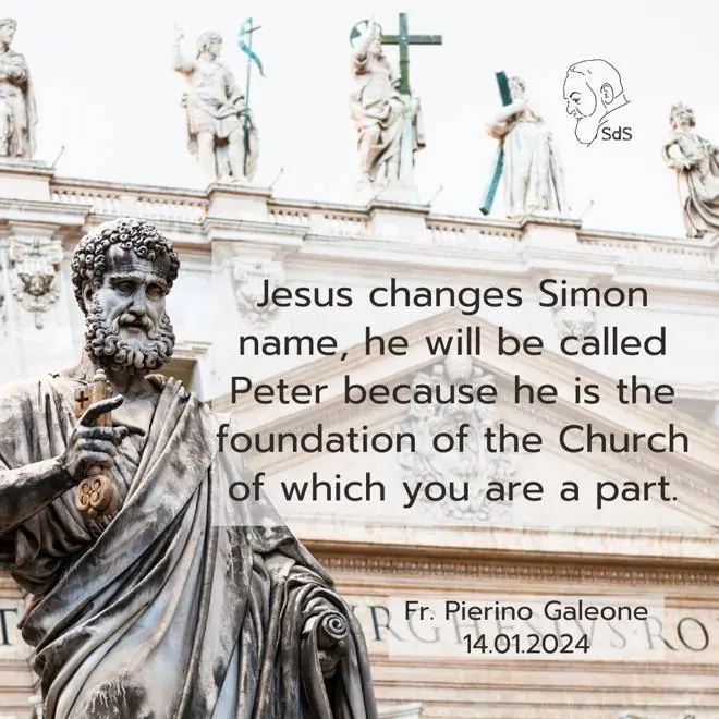 14.01.2024 Jesus changes Simon’s name, he will be called Peter because he is the foundation of the Church of which you are a part. Fr. Pierino Galeone▶▶clicca qui per vedere su Telegram