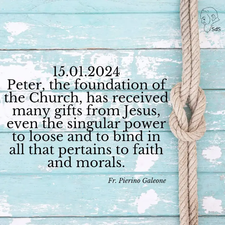 15.01.2024 Peter, the foundation of the Church, has received many gifts from Jesus, even the singular power to loose and to bind in all that pertains to faith and morals. Fr. Pierino Galeone▶▶clicca qui per vedere su Telegram
