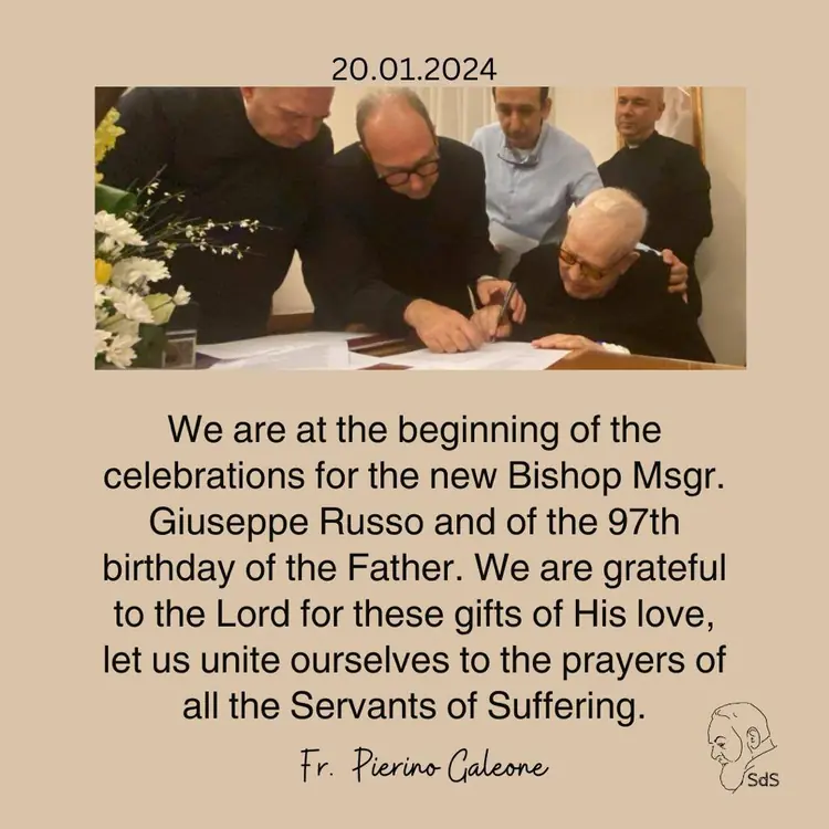 20.01.2024 We are at the beginning of the celebrations for the new Bishop Msgr. Giuseppe Russo and of the 97th birthday of the Father. We are grateful to the Lord for these gifts of His love, let us unite ourselves to the prayers of all the Servants of Suffering. Fr. Pierino Galeone▶▶clicca qui per